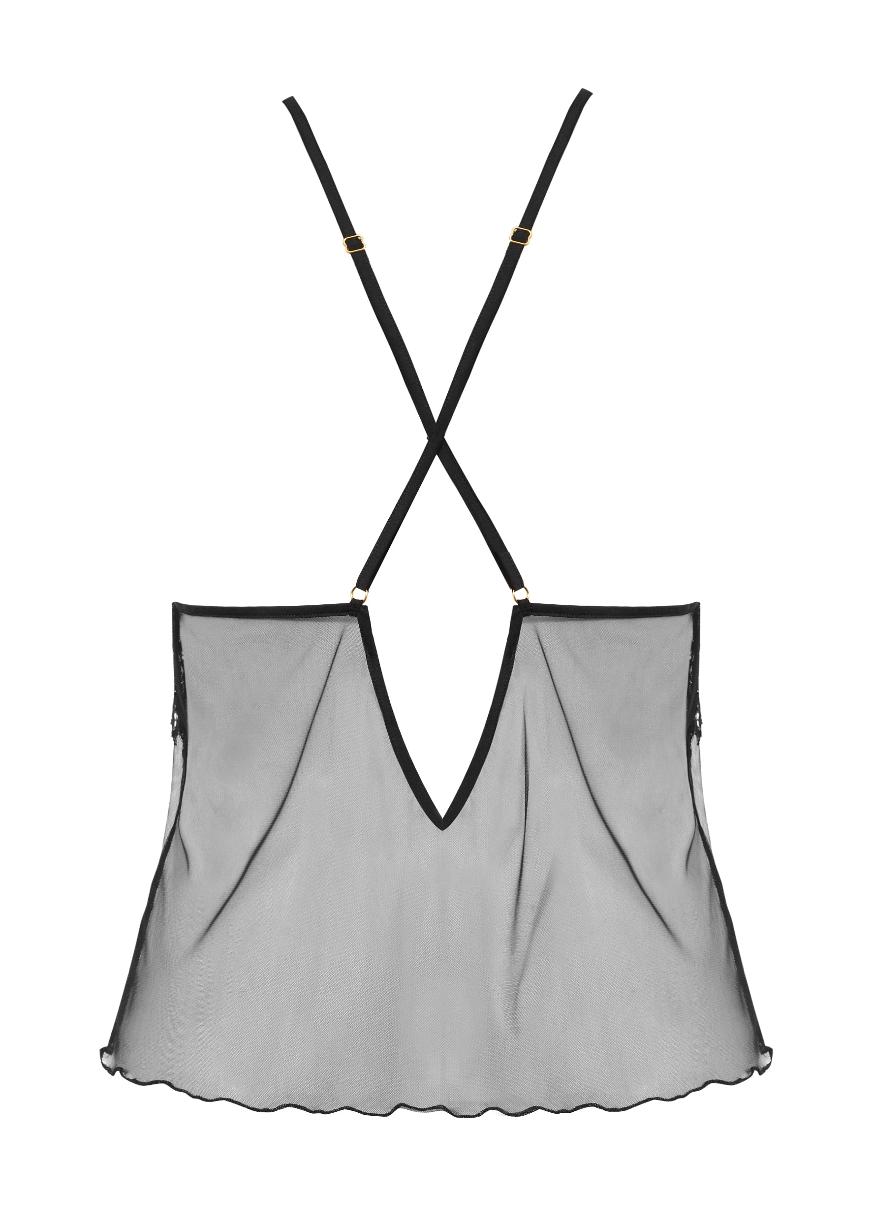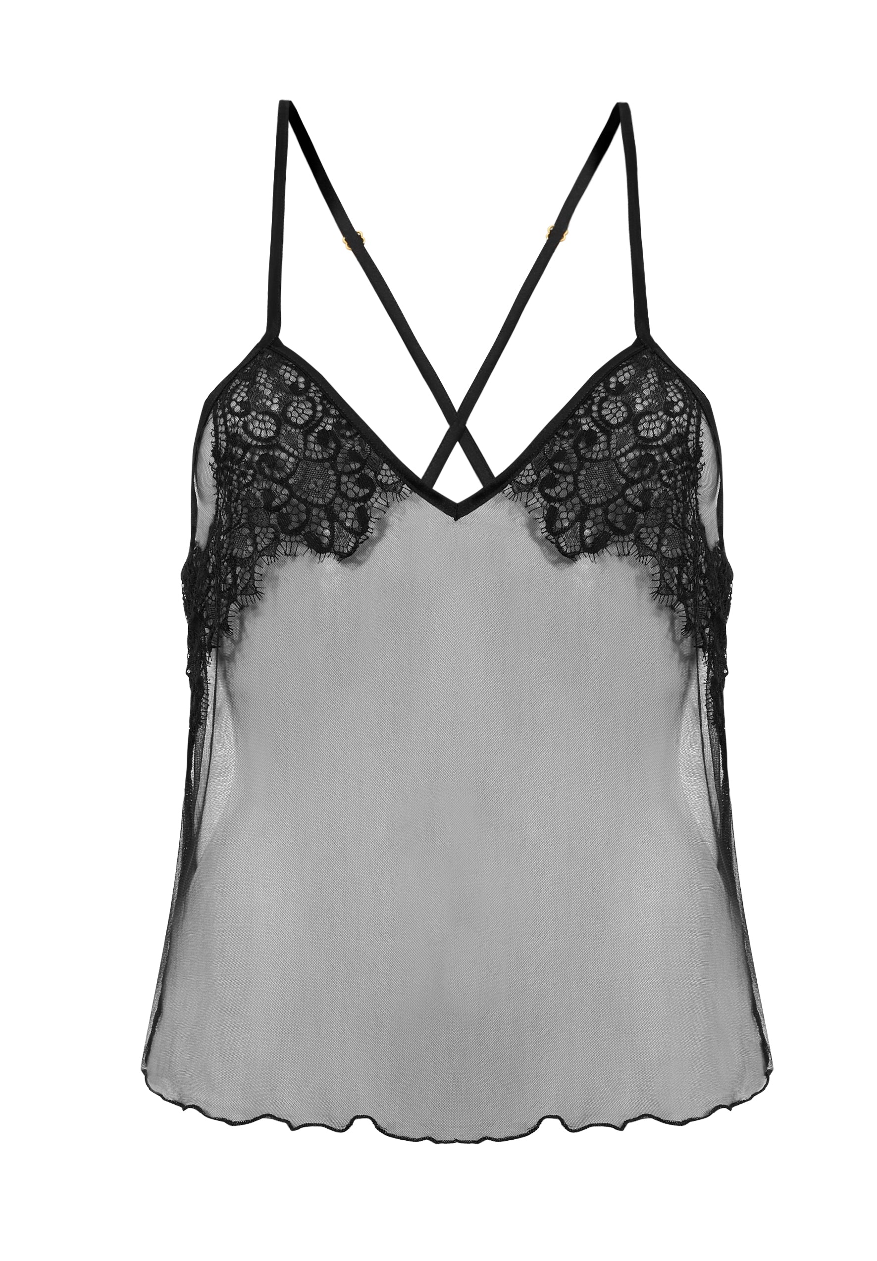 Louise Chemise is made of soft, stable tulle. Finished with satin trimmings. Decorated with lace with deeply cut edges. The straps are adjustable, with gold accessories. The length of the T-shirt reaches the hip line. The bottom is finished with a decorative stitch.