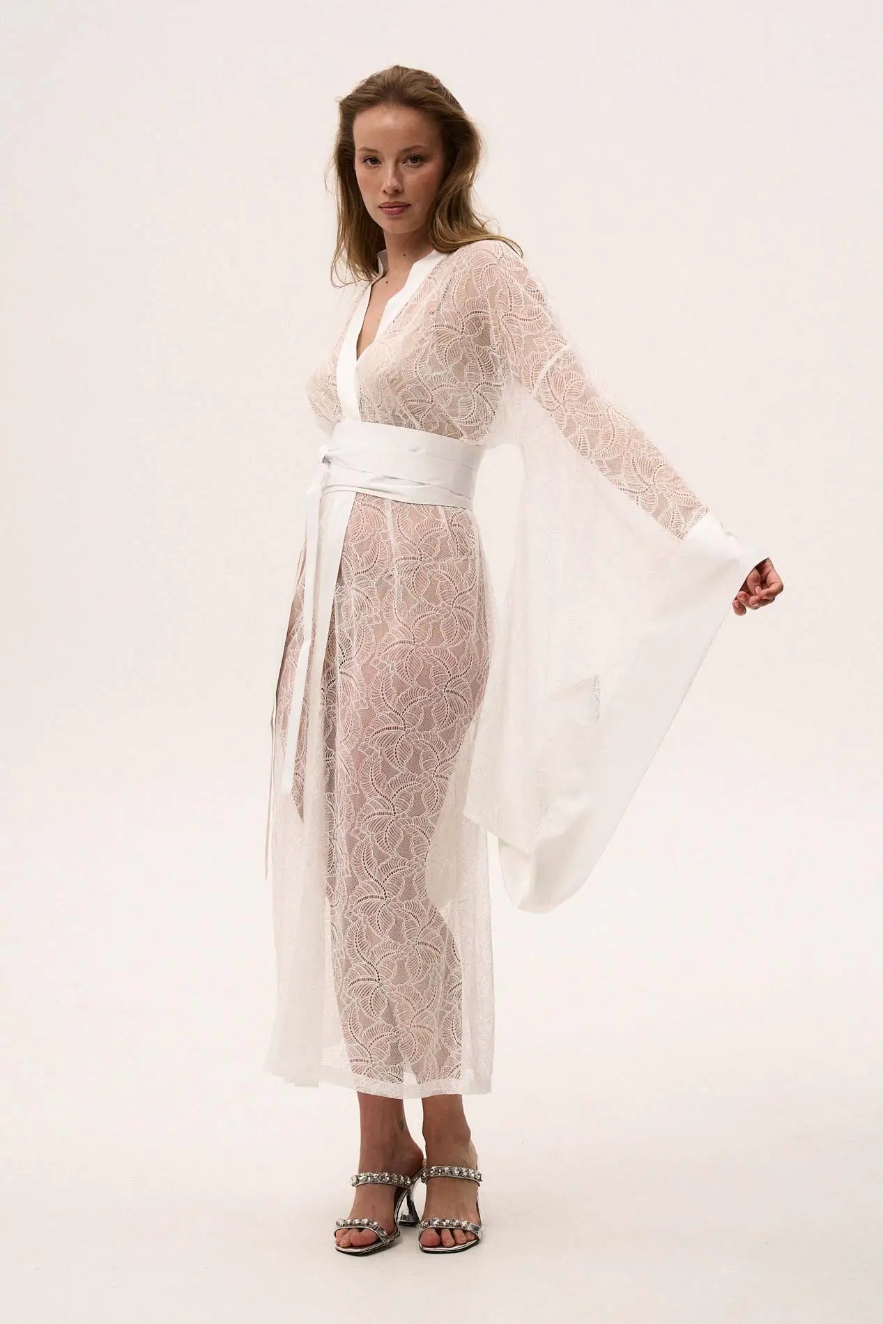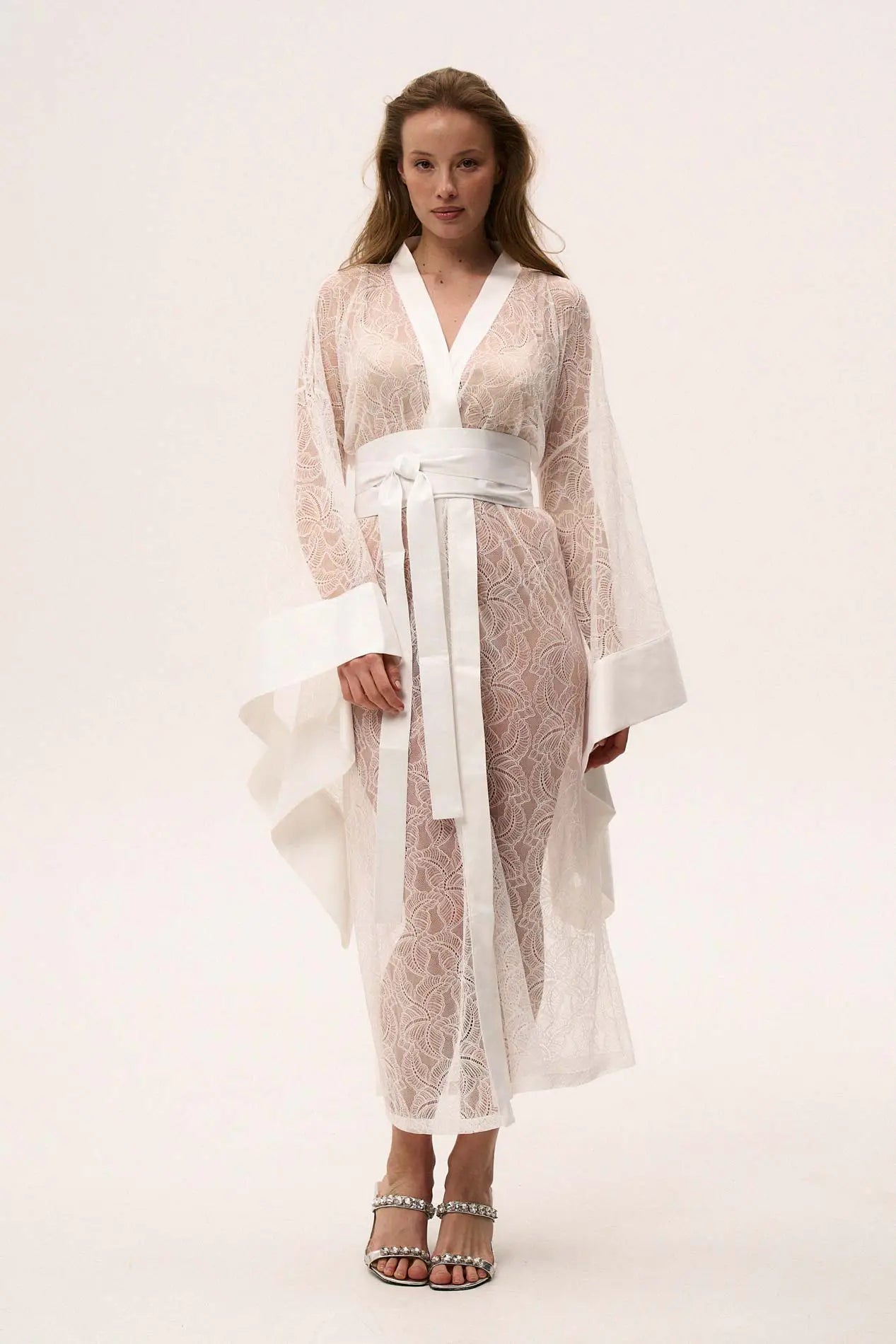 • An obi tie belt enhances your waistline for a perfectly tailored white lace robe.